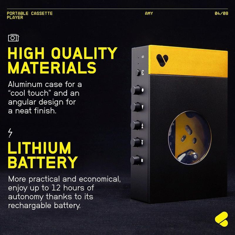 The We Are Rewind cassette player and recorder is made with quality materials for a premium feel and lasting durability. The heavy-duty aluminum casing and built-in rechargeable battery add to the overall quality and portability.