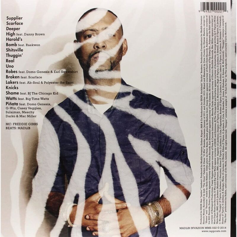 Vinyl Pressing. 2014 album from the rapper and producer. Freddie Gibbs is the product of violent, drug-laden streets but unlike most rappers with similar resumes, he brings the block to the booth without inhibition or an exaggerated rap persona. PINATA, a 17 track collaboration with producer Madlib, is the best distillation yet of his transparent approach to making music, combining an at times stark honesty with electrifying talent as a lyricist and performer. PINATA is 'a gangster Blaxploitation film on wax,' says Gibbs, who came up on the streets of Gary, Indiana, the disregarded city previously best known for producing Michael Jackson. Here he is joined by Mac Miller, Earl Sweatshirt, Raekwon, Scarface, Domo Genesis, Ab-Soul and a host of others in setting his soliloquies of the streets alongside film snippets and dusted Funk, Soul and Progressive musical tapestries.