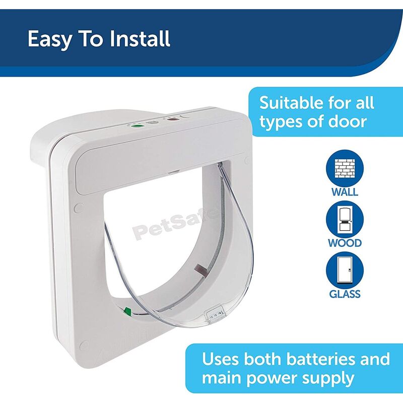 The Petporte smart flap's Microchip Cat Flap has been designed to allow your animals easy access to the outside world whilst keeping other troublesome cats out of your house. The Petporte smart flap cat flaps do not require your animals to wear collars or accessories. The Petporte smart flap Microchip Cat Flap reads the unique identification number stored on your cat's microchip that your vet has implanted in your animal Important information For installation into glass a circular cut out of 212 mm diameter is required Installation into a non glass surface a cut out of 171 mm by 180 mm is required Night mode: uses a built-in light sensor which activates in-only access for authorised cats at dusk and automatically allows free exit at dawn. This keeps cats in at night and reduces the chances of them becoming involved in road traffic accidents. Vet mode: applies a similar setting that allows authorised cats in-only – handy when they are due a trip to the vet. Extended modes:(requires mains power) allows cat owners to customise the cat flap to their cat's routine and their own convenience. Mains powered cat flap with battery back up in case of a power cut. Box Contains 1 x PetPorte Smart Flap Cat Flap 1 x Installation guide 1 x Cutting template NOTE: THE CUSTOMER CAN PROGRAMME ON BATTERY ONLY TO ALLOW THE CAT ENTRY (IF NOT FITTED IN A WALL)
