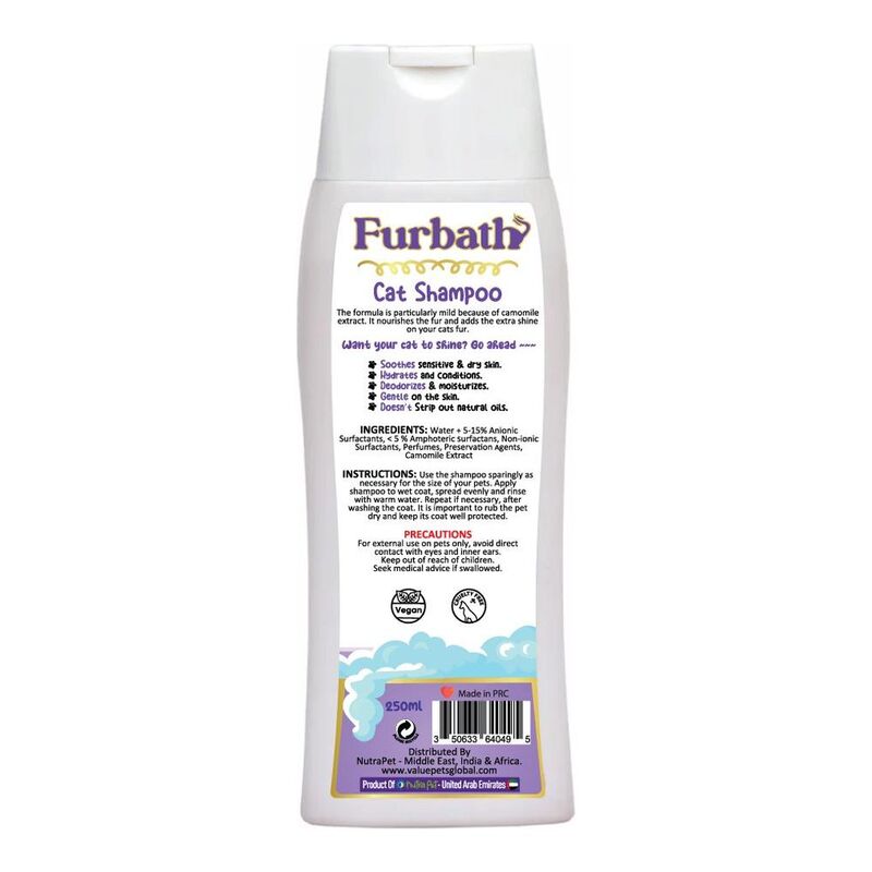 Furbath Cat Walk Shampoo, the ultimate grooming solution for cats with both short and long hairs. Enriched with the soothing properties of chamomile extract, our 250ml bottle offers a luxurious bathing experience that pampers your furry friend while effectively cleansing and conditioning their coat.