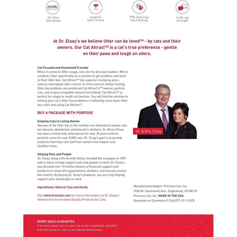 Dr. Elsey's Precious Cat Attract Litter is the problem cat training litter! This scoopable litter provides a solution for cat owners whose cats do not use their litter box. Blended with a natural herb attractant, Cat Attract's herbal scent, ideal texture and particle size combine to solve litter box problems. Non-use of the litter box is the number one reason a cat is abused or finds itself in a shelter. Cat Attract is the first cat litter to specifically address problem cats. Each box has a free Litter Box Solutions Booklet to help cat owners solve their litter box problems.