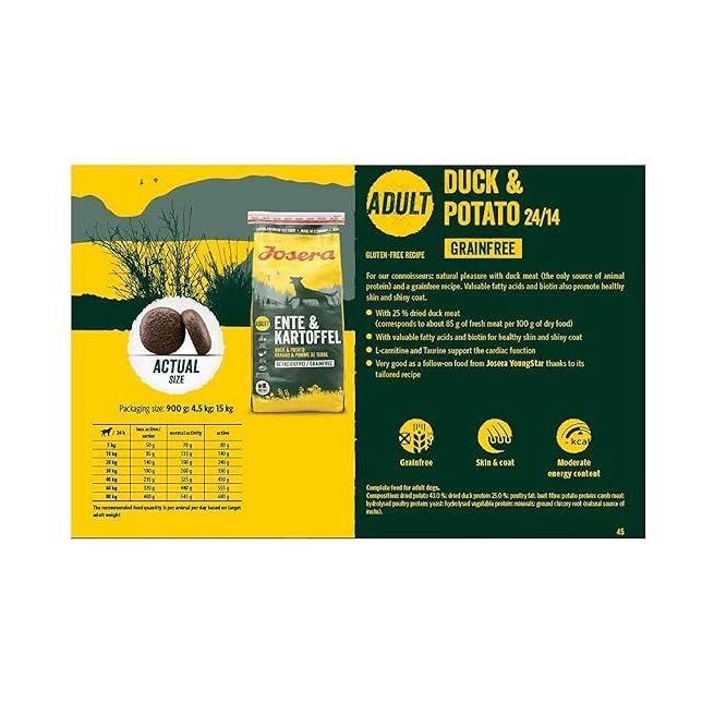 For our connoisseurs: natural pleasure with duck meat (the only source of animal protein) and a grainfree recipe. Valuable fatty acids and biotin also promote healthy skin and shiny coat.