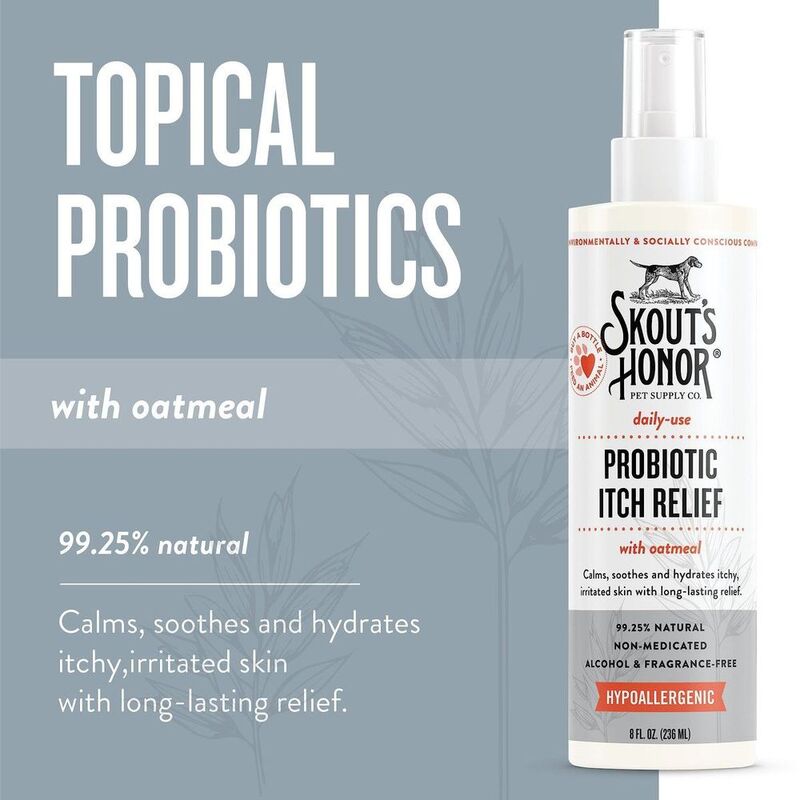 If your furry friend has an itch that just won’t quit, then try Skout's Honor Probiotic Itch Relief! This daily-use probiotic spray is formulated with oatmeal to calm, soothe and hydrate itchy, irritated skin. This non-medicated, alcohol-free formula provides long-lasting relief and it’s completely hypoallergenic, making it paw-fect for pets with sensitive skin!