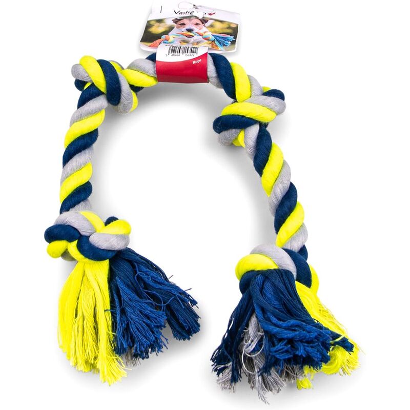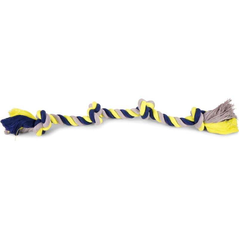 Measuring approximately 58cm in length, the cotton rope features a unique design with four knots, making it easy for your dog to grip and play with. The vibrant blue and yellow colors add visual appeal and make the toy easy to spot during playtime.