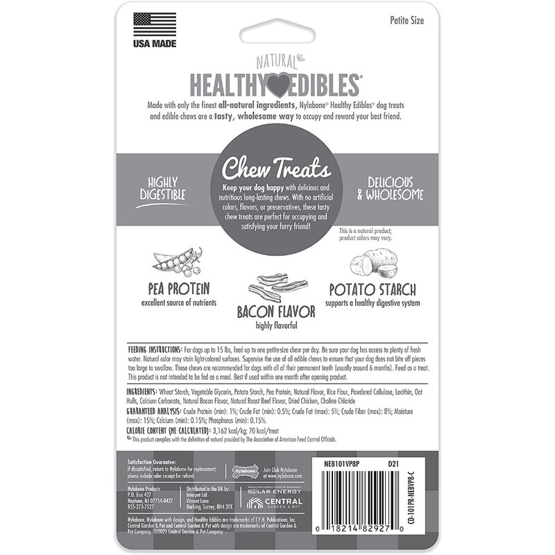 Bacon makes everything better! Our USA-made Healthy Edibles Bacon Dog Treats are packed with scrumptious flavor that dogs just can't resist. Crafted with wellness in mind, these healthy dog treats are made with natural ingredients and contain added vitamins and minerals. The longer-lasting, highly digestible formula satisfies dogs who love to chew and do not contain any added salt, sugar and artificial preservatives. There is a size for every dog, so indulge your dog's craving for bacon no matter how big or small. Whether you're treating or training, our chew treats will let your pooch know they've been a good dog!