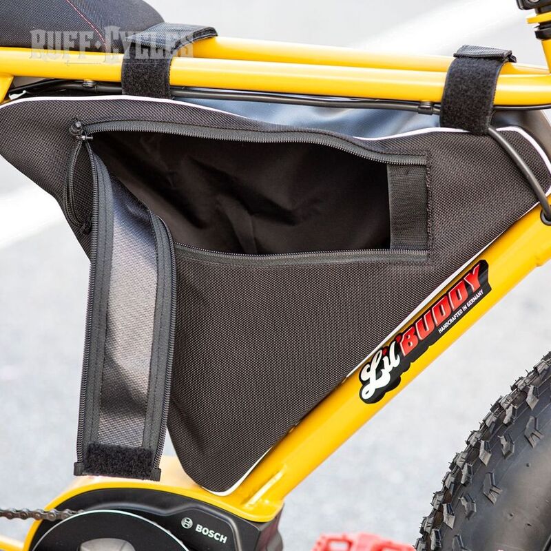 This small bag fits ideally into the front triangle of a Lil'Buddy. It located near the frame tubes to make sure it's not standing out more than needed. You can join two compartments into single one if you need to store bigger items. This makes the bag a perfect partner for going on short rides in the city or countryside.