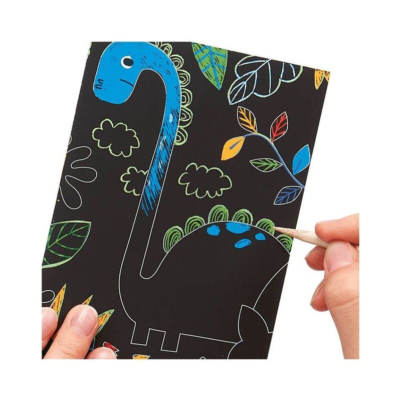 Get busy scratching because dinosaur adventures are waiting! These fun dinosaur themed scratch art cards are filled with easy-to-follow guidelines to reveal the dino inspired rainbow artwork. Sized for on-the-go fun at 4 x 6 inches these mini scratch art kits for kids are great for travel. Each kit not only has 4 cute dinosaur illustrated cards but 2 blank cards for creating your own designs, all revealing a rainbow of color using the included wooden stylus.