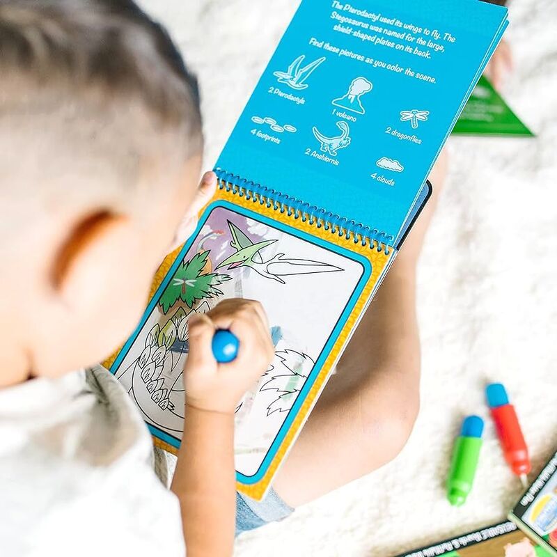 4 spiral-bound dinosaur-themed coloring boards and refillable water pen Reusable pages are white with simple line drawings when dry; reveal colors and patterns when wet Chunky-size water pen is easy to fill, easy to hold, stores in compact, spiral-bound book--great for travel Promotes fine motor skills, early writing/reading skills, and visual discrimination Makes a great gift for preschoolers, ages 3 to 5, for hands-on, screen-free play
