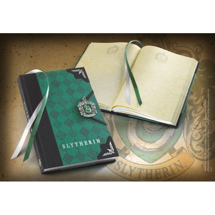 Two ribbons in Slytherin House colours help keep place in your journal which is finished with a die cast spot enamelled metal clasp closure.