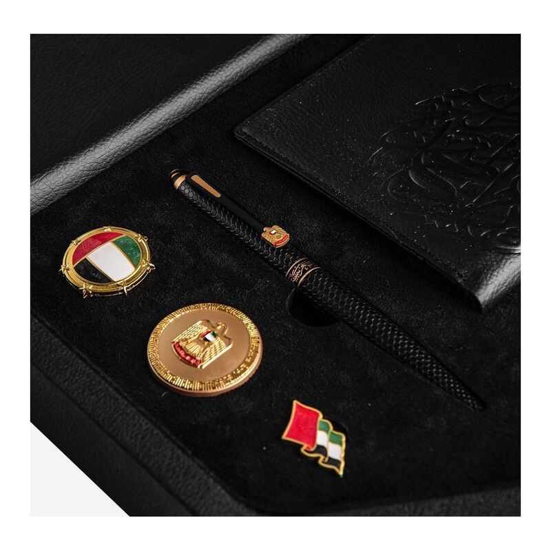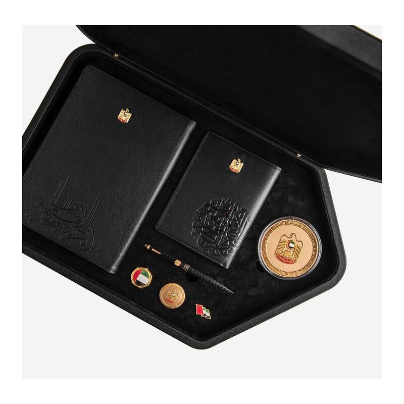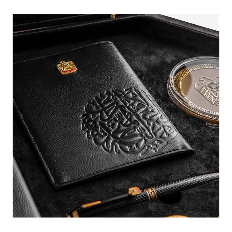 A black leather gift box contains luxury velvet scarf, pen, notebook, coin, special badges (UAE flag, UAE logo & UAE emblem).