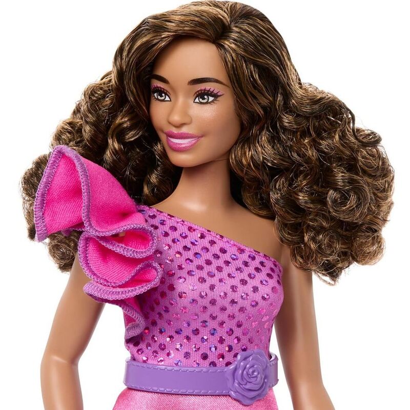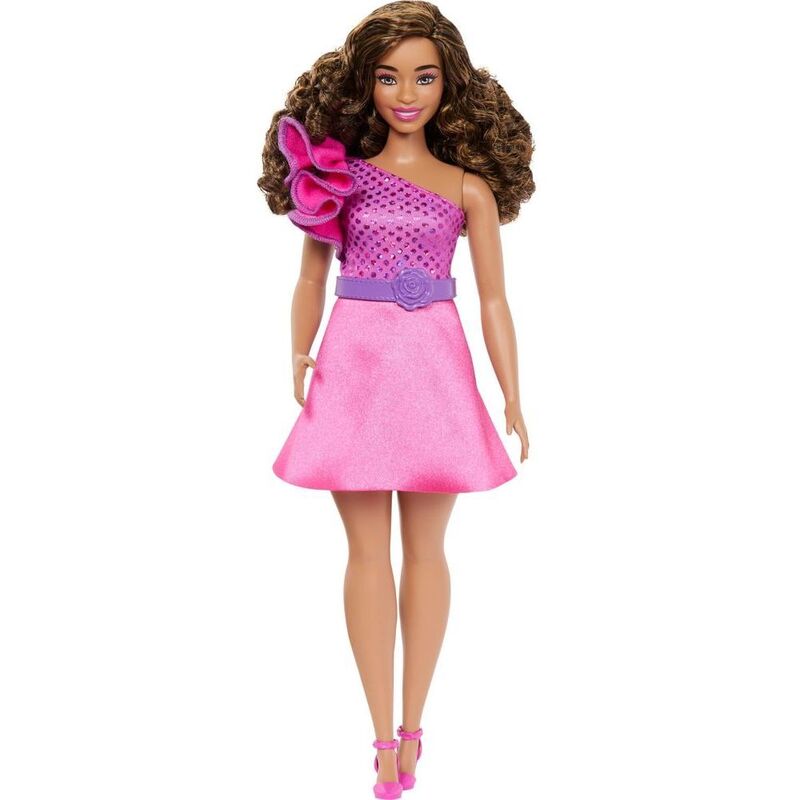 - Inspired by her Dream Date look from 1993, Barbie Fashionistas doll wears a pink dress with one-shoulder ruffle and sparkly bodice!