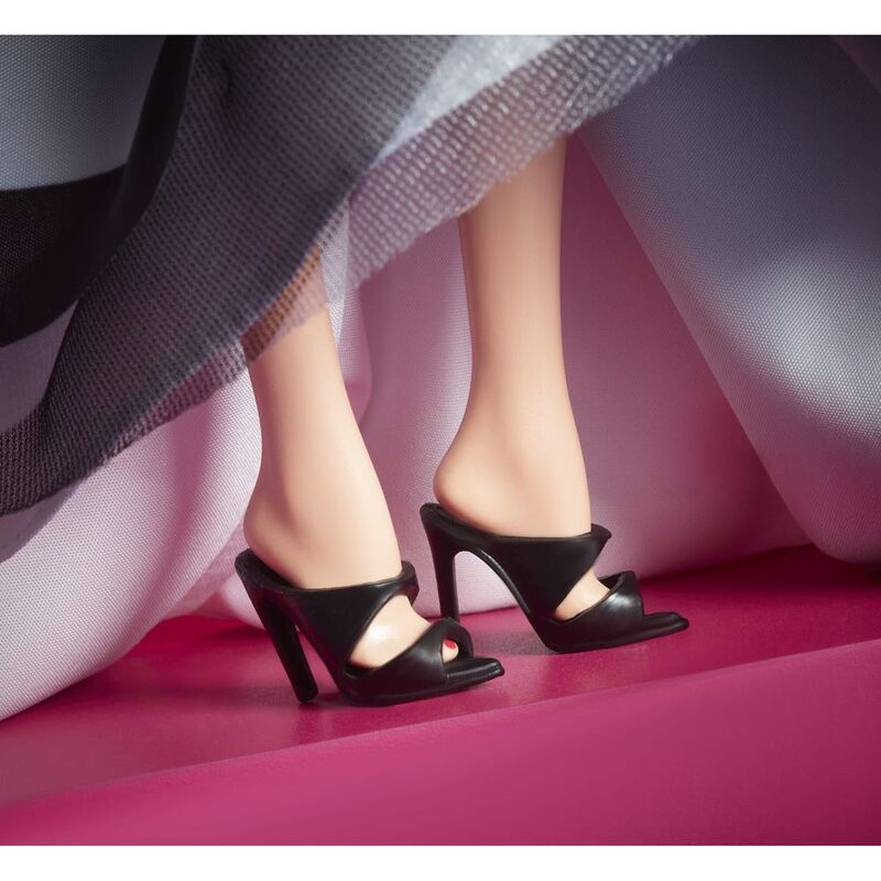 • She wears a black and white gown inspired by the swimsuit that the original Barbie doll wore. A fitted sweetheart bodice blooms into a voluminous striped skirt.