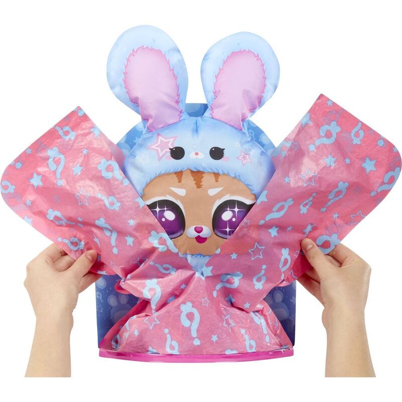 This outrageously fun, experiential reveal is bursting with layers of surprises, perfect for endless imaginative and storytelling play for kids. Discover what’s inside by first tearing the zipper at the bottom of the packaging and lifting the outer pink shell to reveal a mystery wrapping paper, kicking off the first stage of the inflating process! Watch as the paper grows bigger and fuller and once completely inflated, rip open the paper to discover your charming blue bunny costume! But wait, the surprise doesn’t stop there! Undo the Velcro from the back of the bunny’s head to unveil your gorgeous Tweens Aya Cherry doll hidden inside!