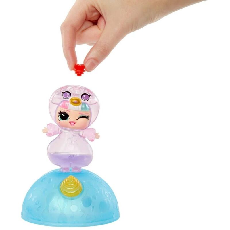 To customize her magical design, set the bottom half of the ball on the included playmat opening side-down and attach your tot to her built-in display stand on the ball. Locate the opening on the top of your doll’s cute face and use the funnel and adorable heart droppers to carefully squeeze the colorful potions inside your tot. When you’re ready for the magic to happen, seal the opening with your tot’s unicorn horn and turn her over to watch the colorful blobs slide past each other!