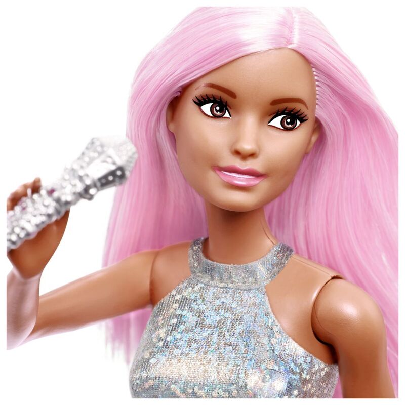 Barbie® career dolls inspire kids to dream big and aim high! Each doll can achieve her goals wearing a career-themed outfit along with accessories to play out professional moments. There are so many careers to explore. Grab the microphone and share the spotlight with Barbie® pop star doll. She wears an outfit that will sparkle on stage and comes with a microphone and stand. Plus, her long pink hair hits all the right notes! Explore and collect all the Barbie® career dolls and toys because when a girl plays with Barbie®, she imagines everything she can become (each sold separately, subject to availability). Includes pop star doll wearing fashions and shoes, plus microphone and microphone stand. Doll cannot stand alone. Colors and decorations may vary.