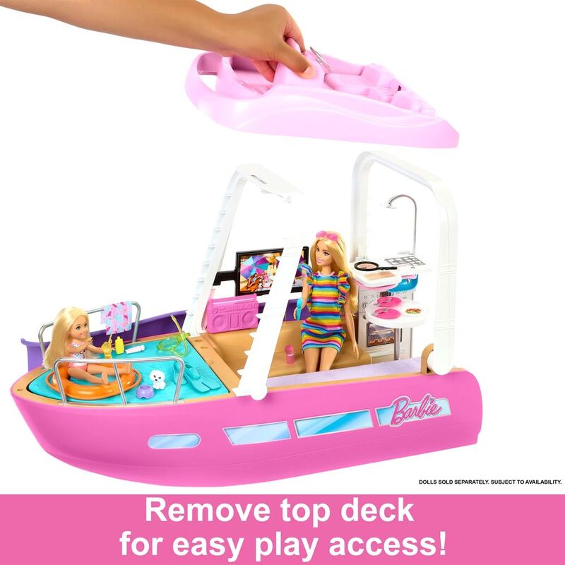 - Make waves with the Barbie® Dream Boat™! This playset is decked out with premium details like a pool, slide, two different transformations, and so much more.