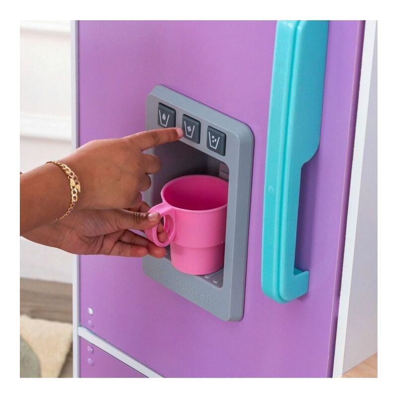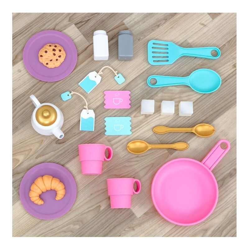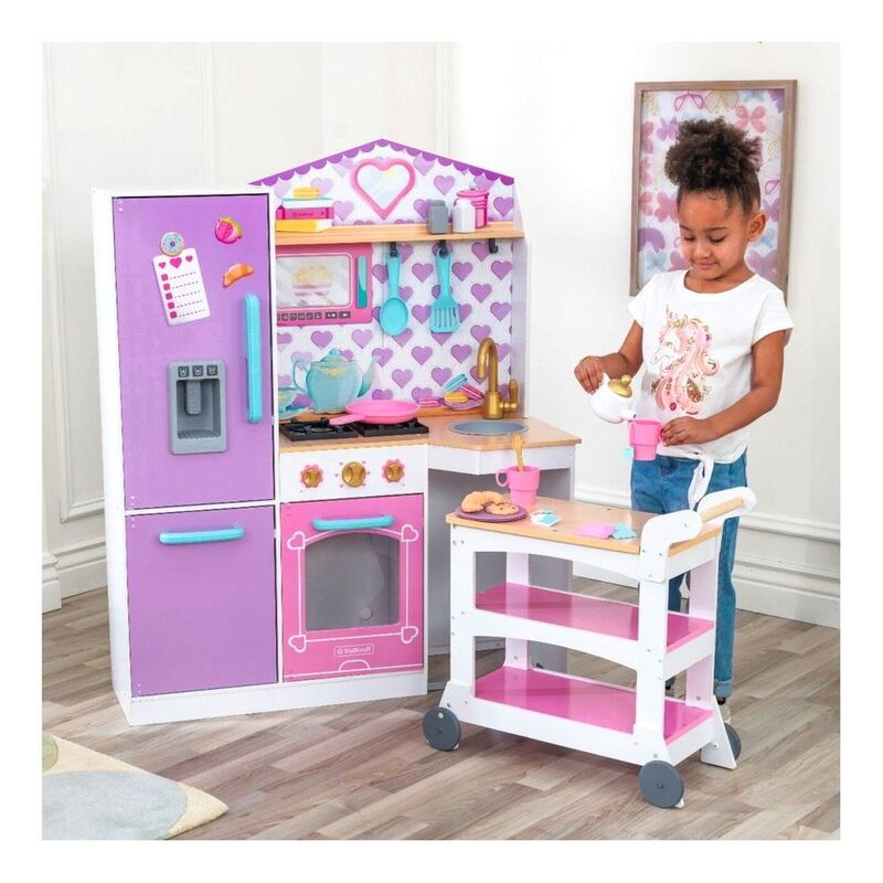 From the heart-print backsplash to the charming tea service, this KidKraft Sweet Snack Time Cart & Play Kitchen is full of love. Prepare teatime at the cheerful kitchen, then place everything on the pull-out cart and serve to guests. Dishes and treats are included to have a party for two. Back at the kitchen, it's easy to store everything—the cart slides back into its cubby and all the doors open to reveal more play spaces. Kids will love interacting with the ice maker with pretend cubes, faucet and turnable knobs. Hosting tea parties or snack time has never been so adorable as with the Sweet Snack Time Cart & Play Kitchen.