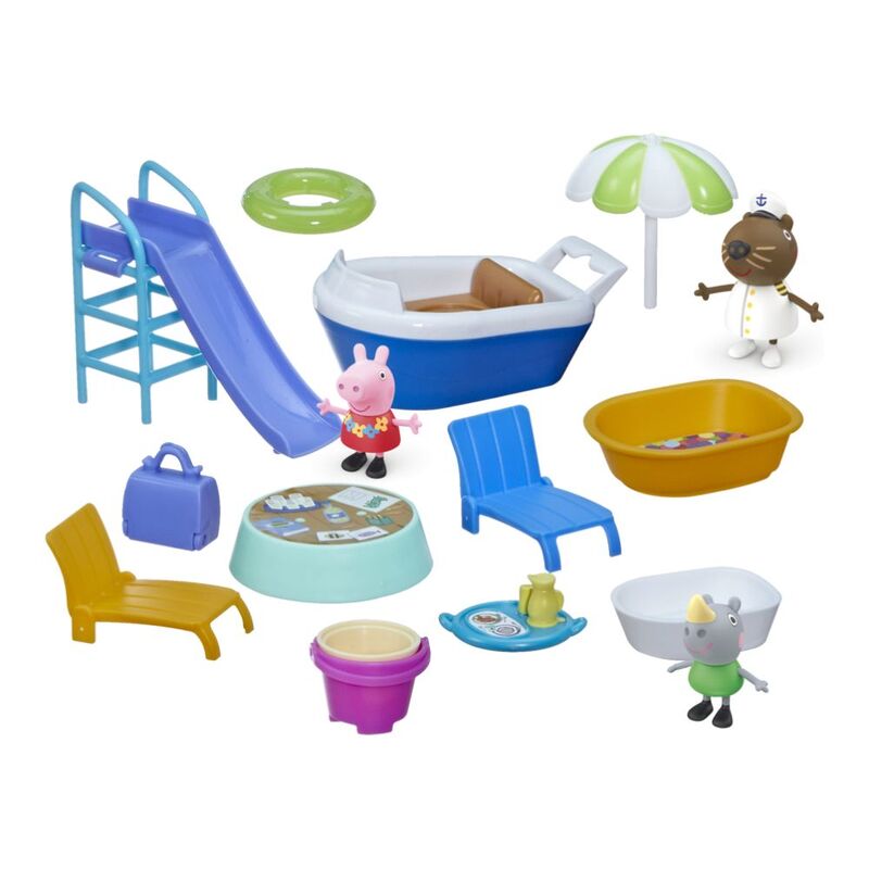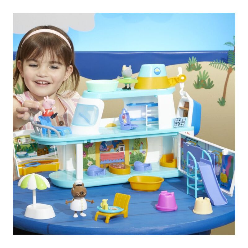 MULTILEVEL PEPPA PIG PLAYSET: Peppa's going on a cruise! The toy ship playset opens up to reveal lots of imagination possibilities, with 3 levels, lots of play areas and accessories, and 3 figures! (Not intended for water.)
