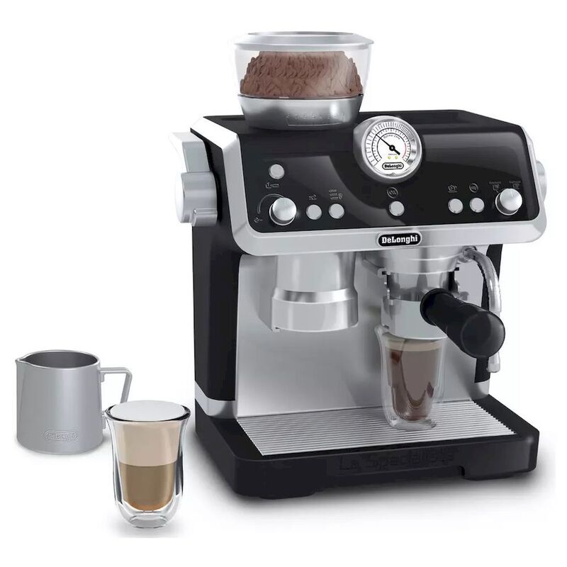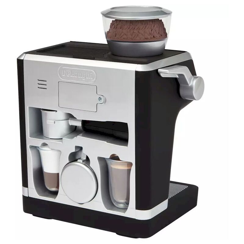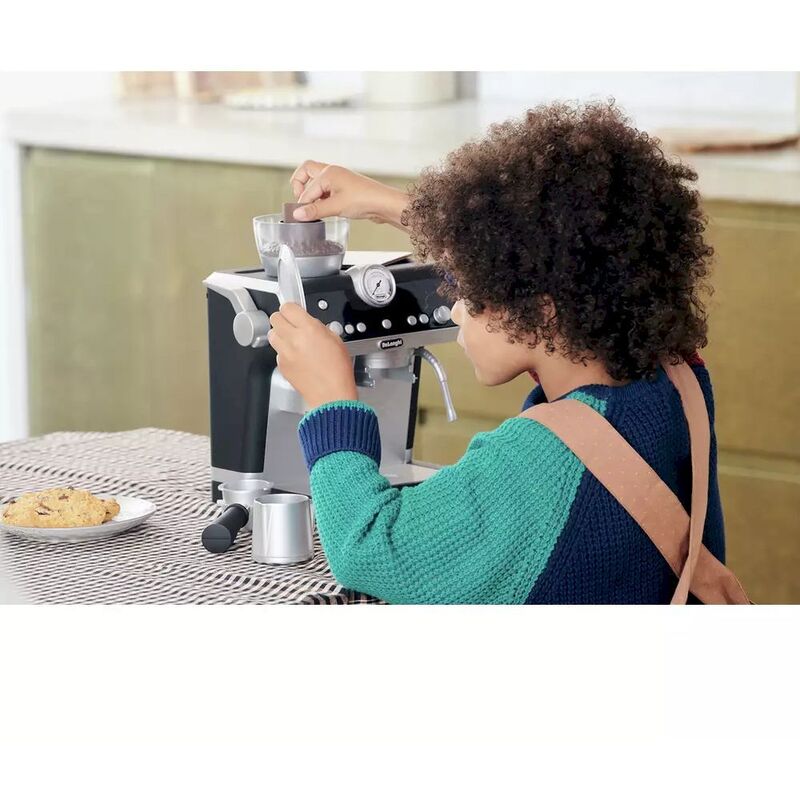 Barista-style coffee machine designed to look just like the DeLonghi La Specialista. With realistic sounds and a magic coffee reveal, the DeLonghi Barista Coffee Machine is sure to provide endless hours of fun! Includes a portafilter, two plastic cups, americano coffee pod, cappuccino pod and milk jug.