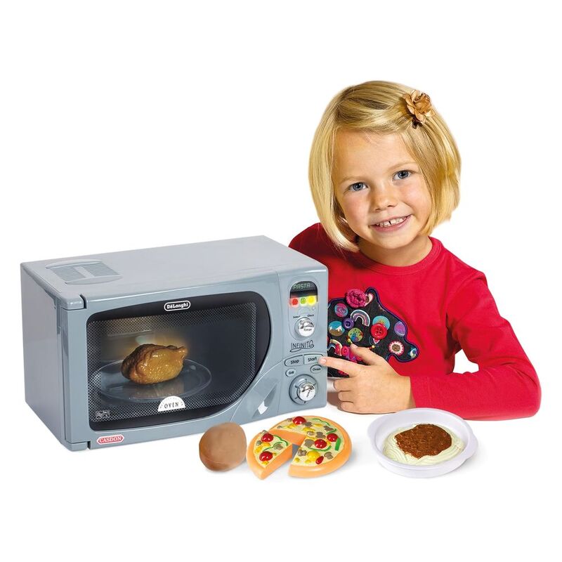 Little Cooks love it when their toy looks just like it should, so this replica of DeLonghi's stylish 'Infinito' microwave combination oven will provide endless role play fun! There's a rotating turntable, various cooking sounds, flashing LED's and an illuminated oven. Select which food to grill or cook, close the door, press the button and wait for it to 'ping' - just like the real thing! Includes 4 pieces of play food. Requires 3 x AA batteries (not included). Suitable for ages 3+.