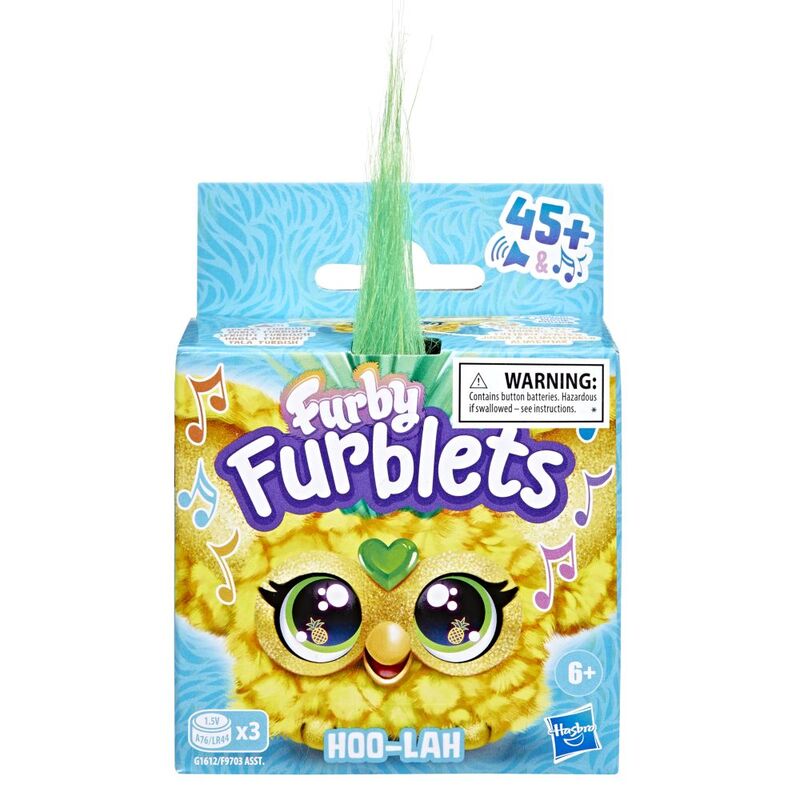 The Furblets are going wild! Good vibes all around with Hoo-Lah the pineapple Furblets friend! Hear over 45 chill island tunes and sounds with this mini Furby electronic toy for girls and boys 6 years and up. Hoo-Lah has yellow fur and a green hair tuft to look like a little pineapple. Also plays fun music and sounds in Furbish (but doesn't speak human languages)