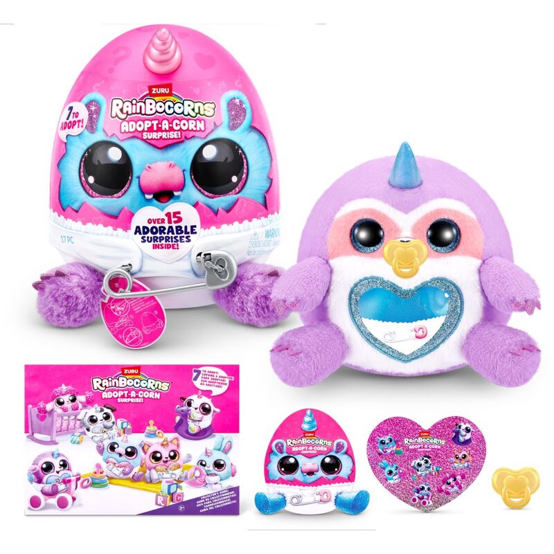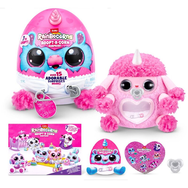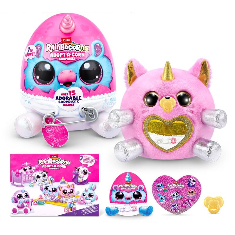 Adopt a brand-new bestie with all-new Adopt-A-Corns! The cutest little baby Rainbocorns are crawling around Rainboville and are in need for your love and care! Unclip your Adopt-A-Corn out of its diaper for adventurous fun and clip back once it's time for some rest. Don't forget about the pacifier! There are 7 Adopt-A-Corns to adopt. Each egg comes with over 15 adorable surprises inside!