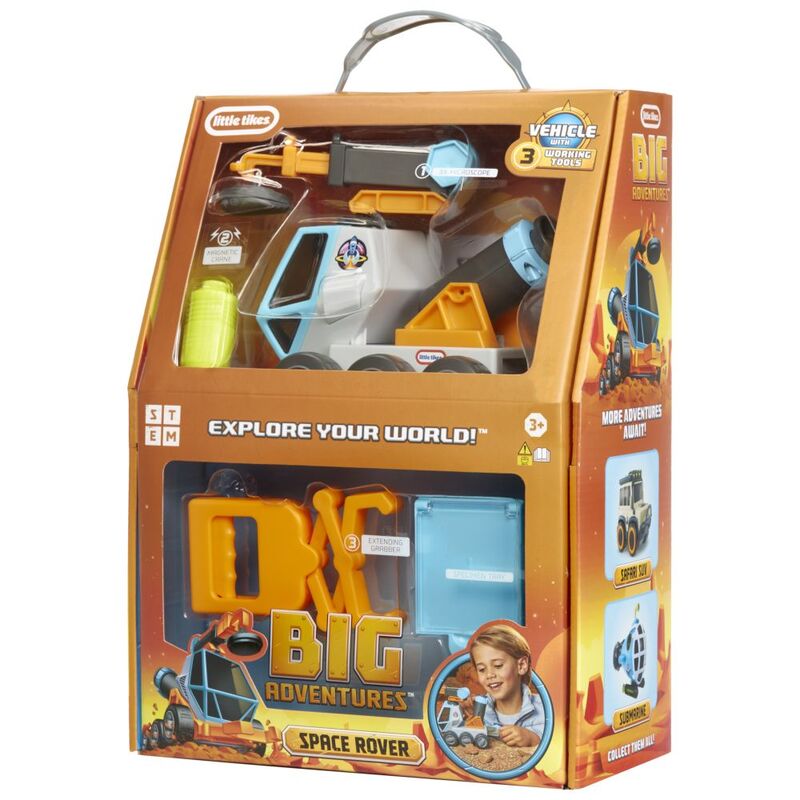 RUGGED VEHICLES, REAL GEAR. Big Adventures toys combine play, fun and learning with real STEM related tools. This Space Rover includes three tools: microscope, extending grabber and magnetic crane
