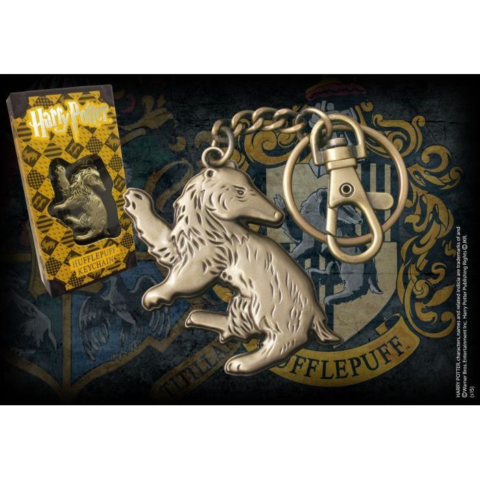 A die cast metal keychain of the Hufflepuff House mascot, the badger. The keychain is presented in a Harry Potter-branded card and window box in Hufflepuff yellow.