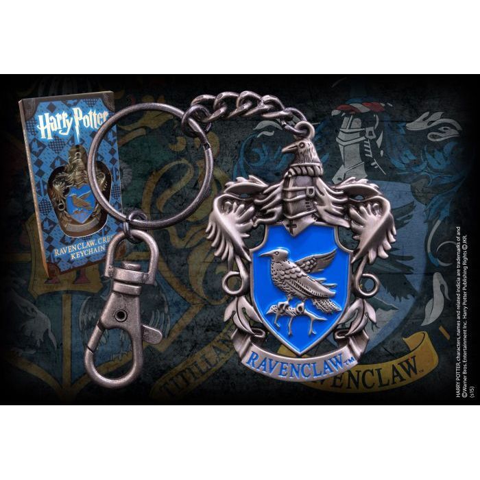 A die cast metal keychain of the Ravenclaw house crest, finished with blue enamel detailing. The keychain is presented in a Harry Potter-branded card and window box in Ravenclaw blue.