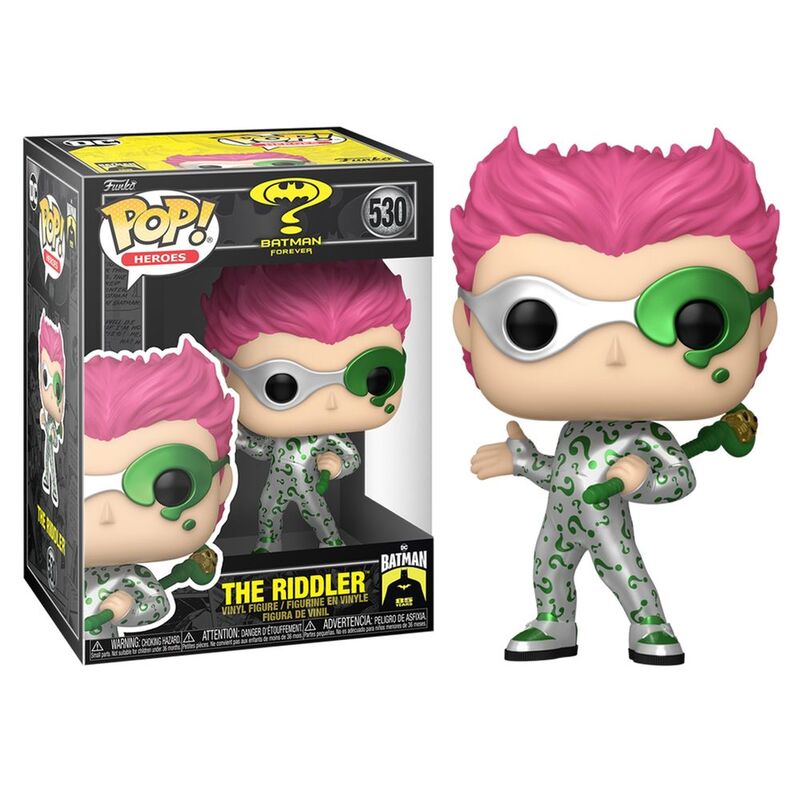 Solve a puzzle with the most quizzical villain around, Pop! The Riddler™! Celebrate 85 Years of Batman™ when you welcome him to your Batman Forever™ lineup as this metallic Pop! The Riddler™. Vinyl figure is approximately 4.15-inches tall.