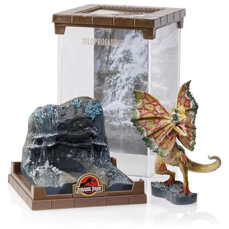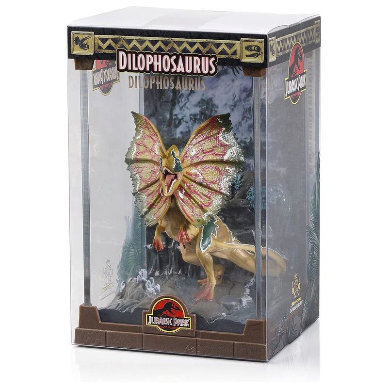 The Dilophosaurus from the Jurassic Park franchise is brought to life in this finely sculpted diorama. The case can be removed and the dinosaur is also removable from base. The diorama measures approximately 7 inches tall. Collect all 3 dinosaurs – Tyrannosaurus Rex, Velociraptor and Dilophosaurus!