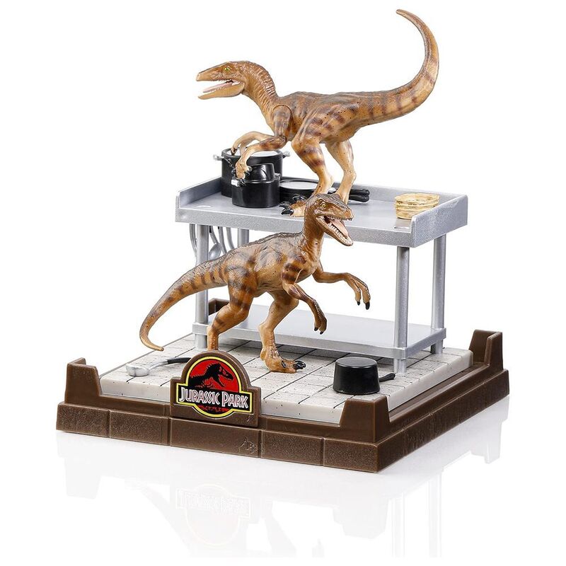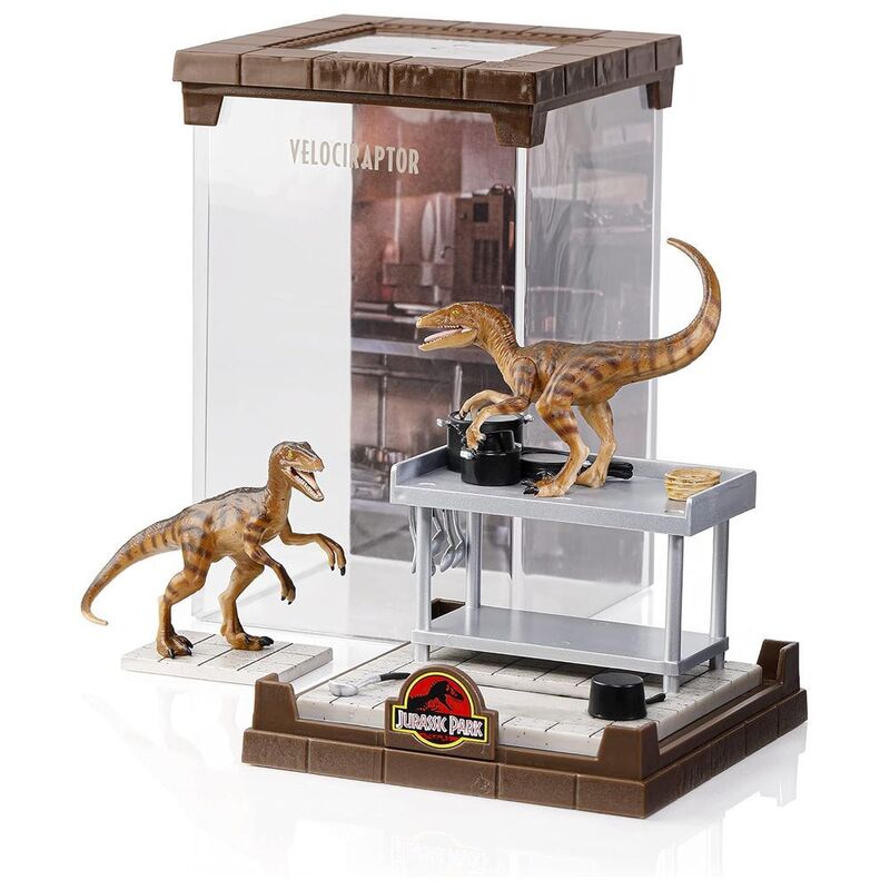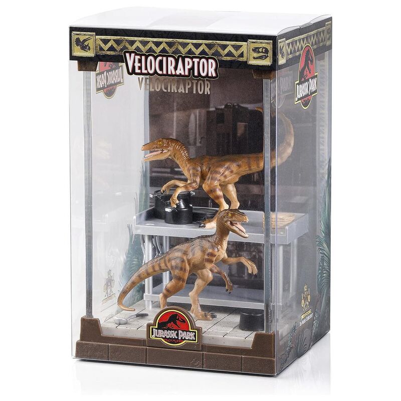 The Velociraptors from the Jurassic Park franchise are brought to life in this finely sculpted diorama featuring two dinosaurs. The case can be removed and the dinosaur is also removable from base. The diorama measures approximately 7 inches tall. Collect all 3 dinosaurs – Tyrannosaurus Rex, Velociraptor and Dilophosaurus!