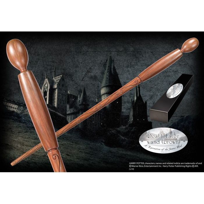 A Death Eater's wand in a brown design. Character box contains name clip. Wand measures approx 38cm.