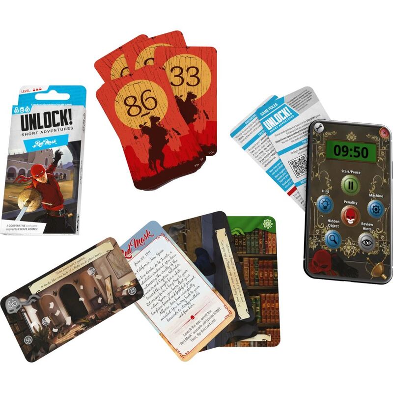 The puzzles, the app, the clues, the timer, a concentrate of Unlock! Unlock! Short Adventures: Red Mask is a difficulty level 2 adventure (out of 3). It contains 30 adventure cards and 2 rule cards.