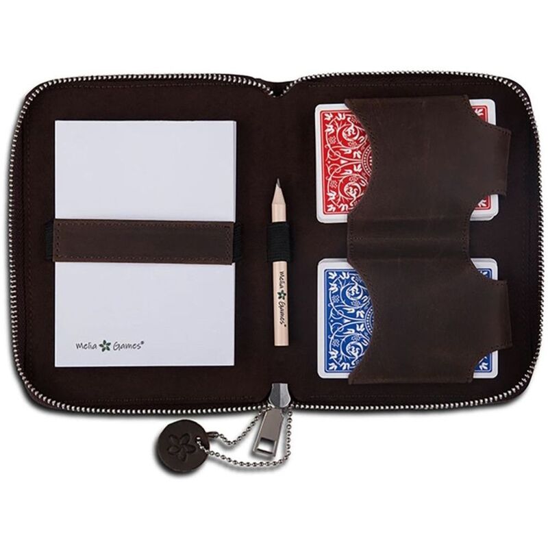 The handmade zip case has been crafted in sustainably-certified genuine full-grain leather. The zip case houses 2 decks of playing cards, perfect for rummy, canasta, bridge and more, a notepad and pencil for score keeping.