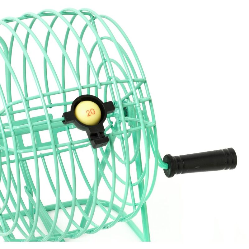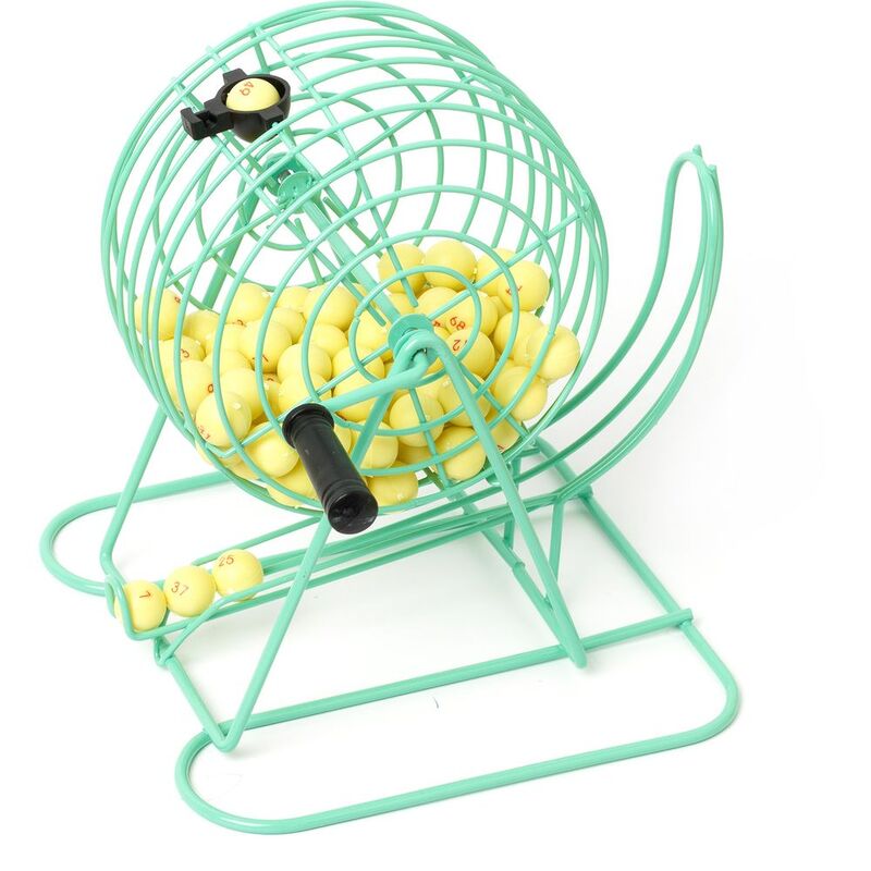 - Contents: 1 metal rotary cage with automatic ball collector, 90 numbered balls, 1 display board, 60 reusable cards, 300 marker counters, 2 fabric pouches.