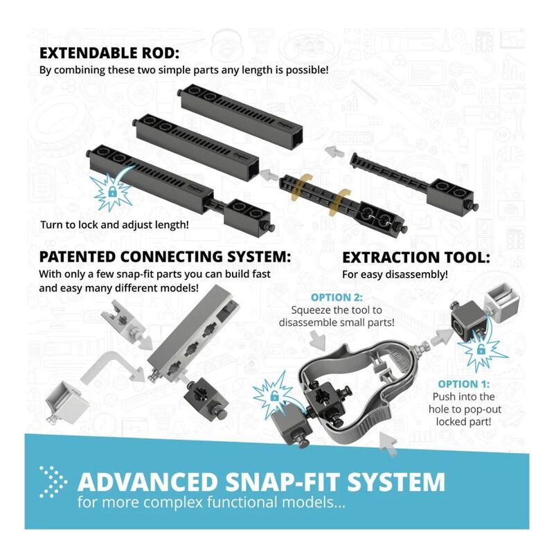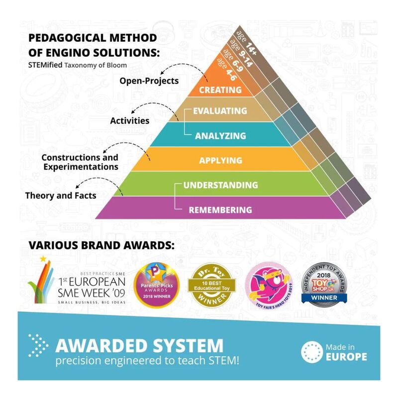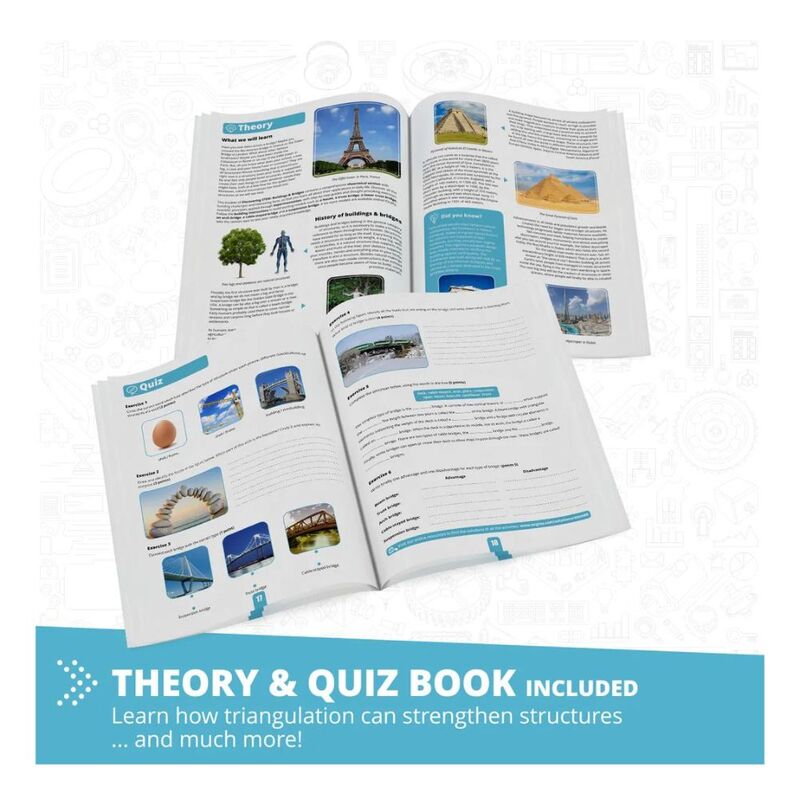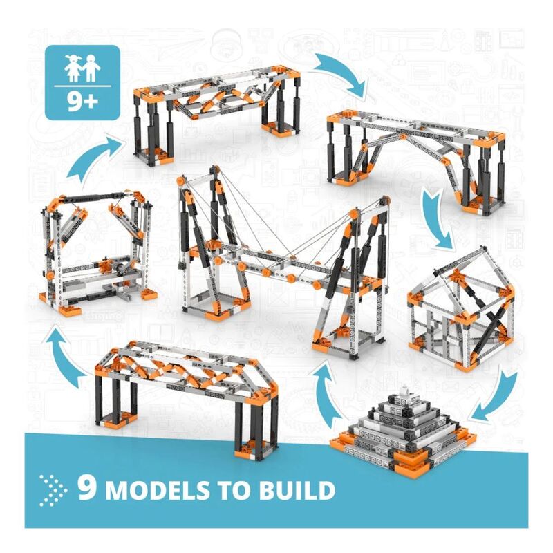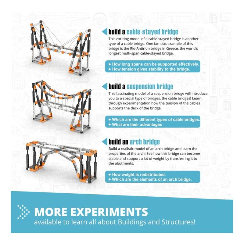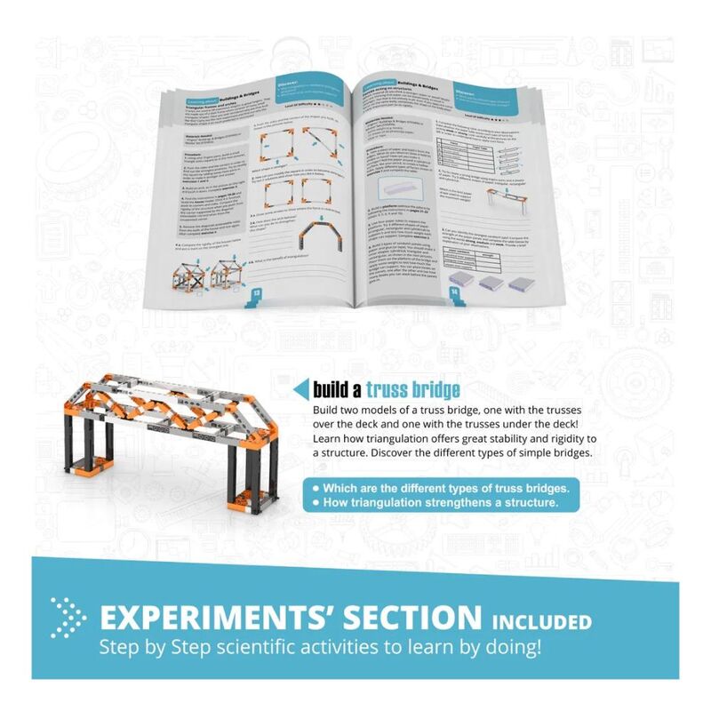 Learn all about buildings and how they literally support our lives! Experiment with different types of bridges and find out how their architecture design provides massive weight support. Discover all the types of forces applied and how engineers manage to reduce their effects. Build 9 working models such as a house, a pyramid and various types of bridges: beam, arch, truss, cable-stayed and suspension bridge. You can find easy-to-follow building instructions for all models either online or in the booklet included. The booklet provides detailed explanations of the different scientific principles applied and incorporates innovative experimental activities for hands-on learning. A Quiz section is also available to challenge your newly acquired knowledge!