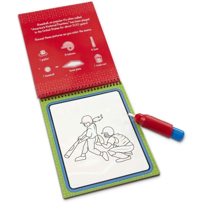 - 4 spiral-bound sports-themed coloring boards (basketball, baseball, swimming, soccer) and refillable water pen
