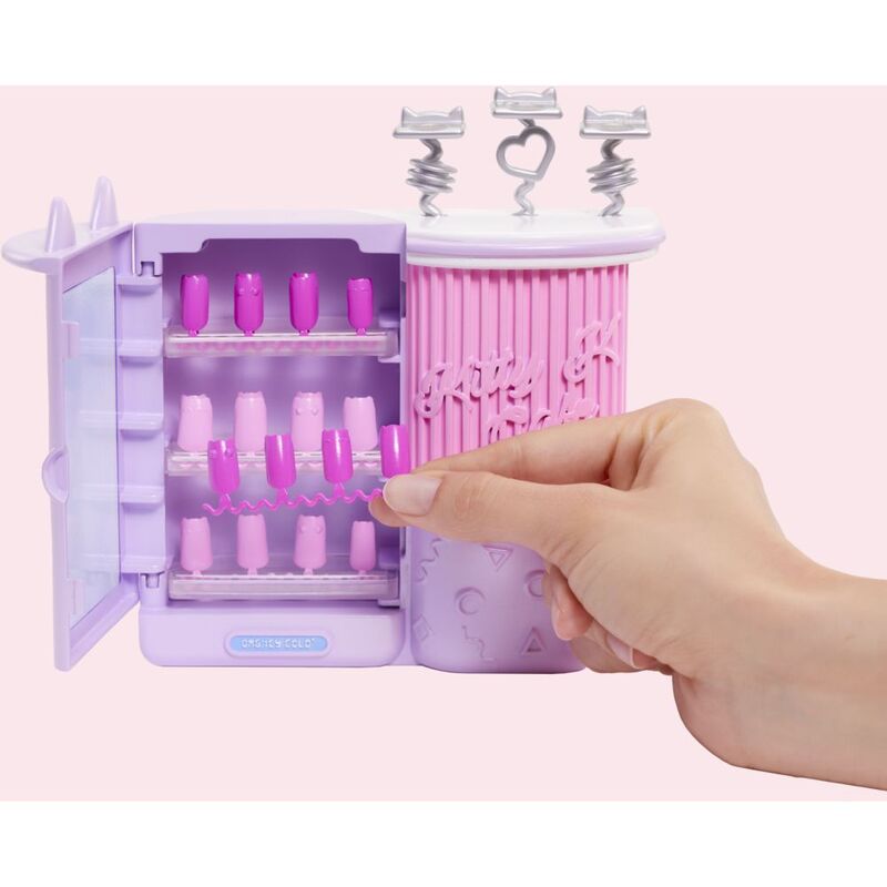 - UNBOX 15 SURPRISES: A nail station that doubles as a mini fridge to display press on nails, nail polishes designed to look like milkshakes, a kitty shaped candy jar that holds real nail glitter, a nail file to shape your nails, nail adhesives to stick on the nails, and nail stickers to decorate your nails!