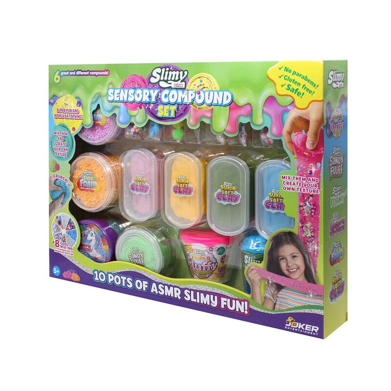 Experience the Slimy Sensory Compound Set with 10 Pots of ASMR Slimy Fun - the ultimate sensory experience for kids and adults alike! Express your creativity and explore the fascinating world of textures with this unique set that includes 6 different compounds and 8 exciting mix-ins. Prepare for hours of slimy fun as you mix and match to create personalized sensory sensations.