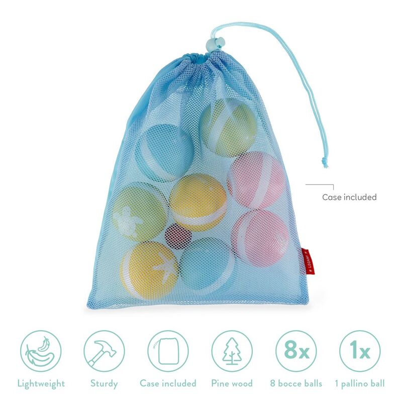 The set includes: 8 bocce balls (Ø 6.2 cm) and 1 pallino (Ø 3 cm)