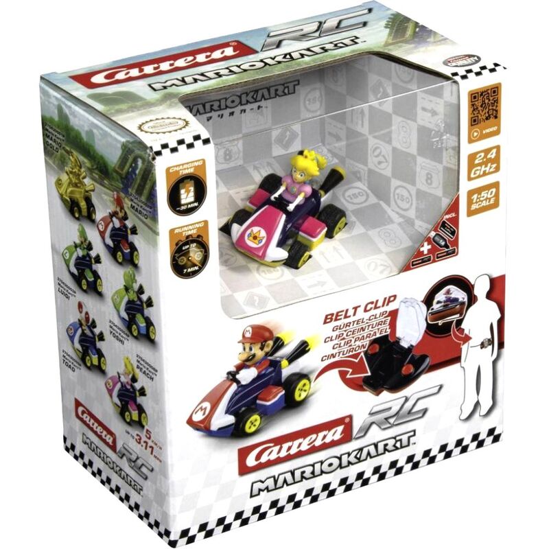 Radio-controlled racing car from Mario Kart, character Peach. This racing car from Carrera works with rechargeable batteries and reaches speeds of up to 5 kilometers per hour. Suitable from 6 years and including batteries.