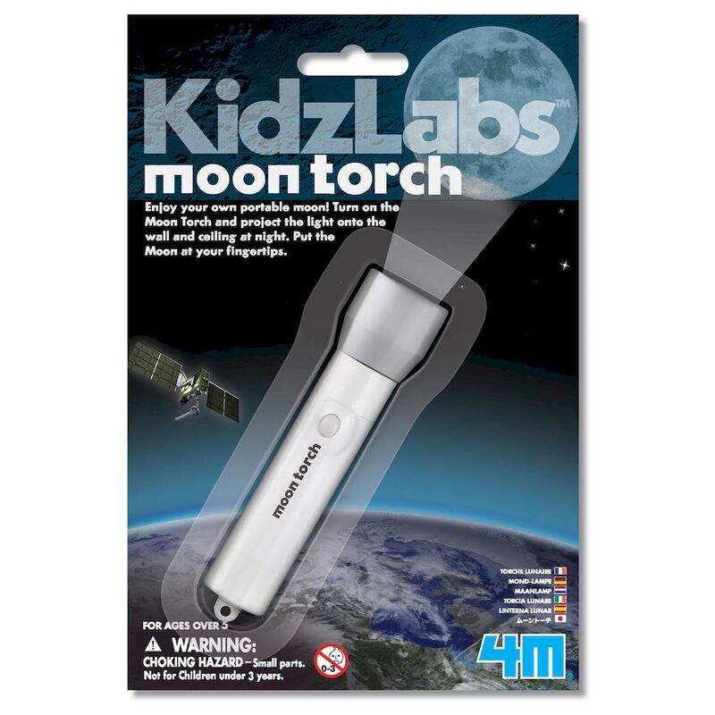 Enjoy your own portable moon! Turn on the moon torch and project the light on the wall and celling at night. This cool gadget puts the moon at your fingertips! Torch measures 4.5" long. Requires button-cell batteries (included). For ages years and up.