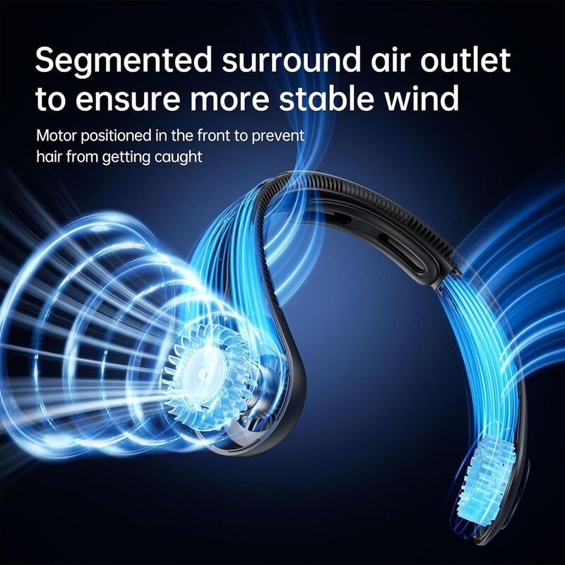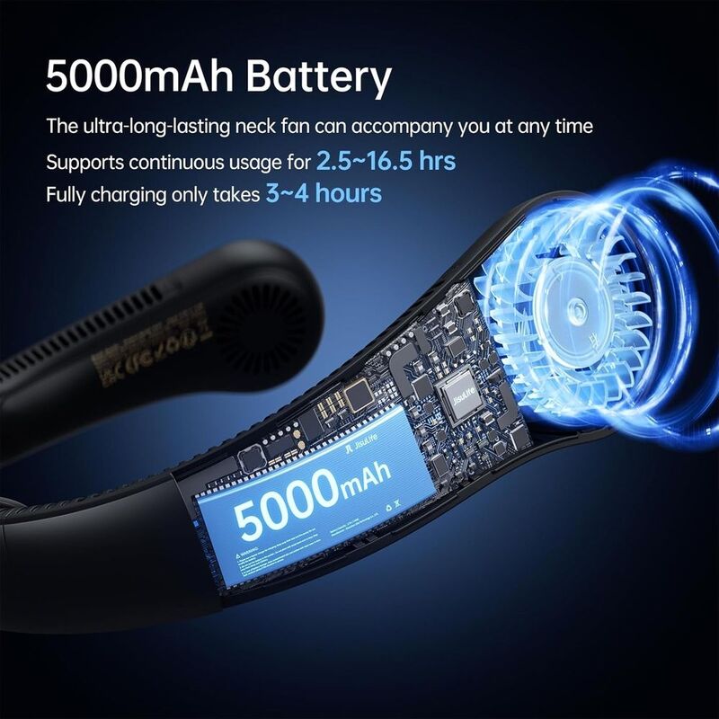 The Jisulife Neck Fan Life4 is a wearable, bladeless neck fan designed for hands-free cooling. It features an upgraded ergonomic neck support, 5 wind speed settings, and a 4000mAh battery for extended use. The fan is designed for comfortable, all-day wear with a focus on reducing stuffiness and providing a powerful, 360-degree airflow.