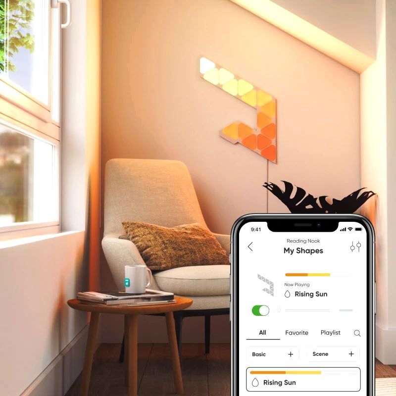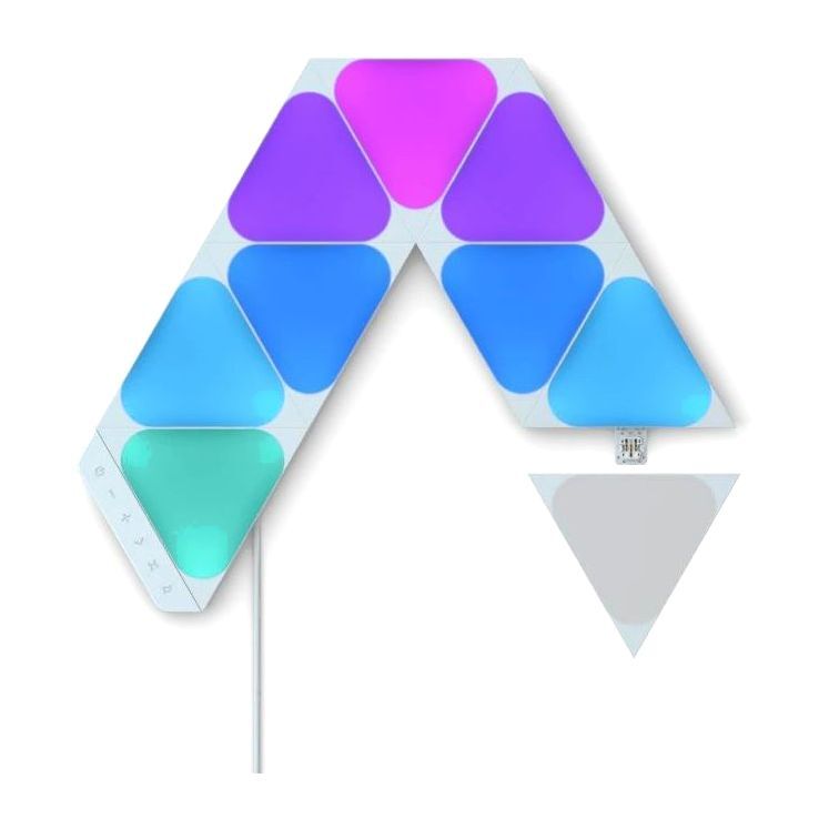 Nanoleaf Shapes Mini Triangles Starter Kit with an ultra-thin panel design come with everything you need to create your own statement or accent lighting. Mix and match shapes to create next-level designs. Packed with all the smart features, such as Rhythm Music Visualizer, Screen Mirror, Touch, Schedules, and more! Instal on any flat surface with included Mounting Tape; no additional tools required. Compatible with all Connect+ products like Shapes and Elements (NL42/NL47/NL48/NL52 models).