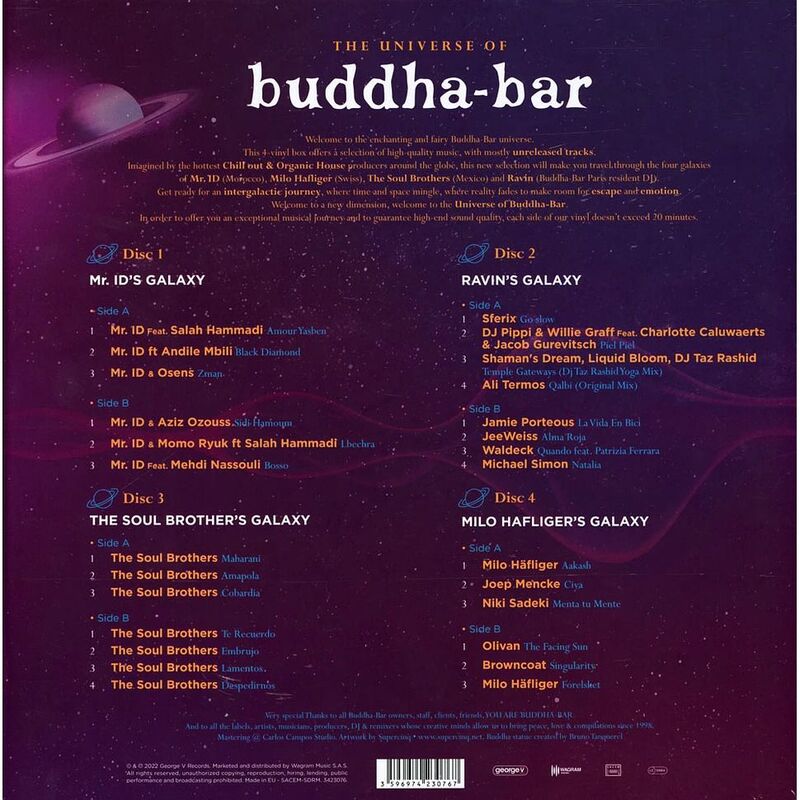 Welcome to the enchanting Universe of Buddha-Bar. This 4-LP box set offers a great selection of mostly unreleased, hypnotizing sounds, captivating and exotic tracks crafted by the coolest Chill-Out & Organic House artists around the universe. This new selection will take you through the four galaxies of Mr. ID (Morocco), Milo Häfliger (Swiss), The Soul Brothers (Mexico) and Ravin (Buddha-Bar Paris resident DJ). Get ready for an interstellar odyssey, an escape through time and space, where reality fades into dreams, where music is the journey. Welcome to a new dimension, welcome to the Universe of Buddha-Bar. Available as a 4CD or 4LP box set.