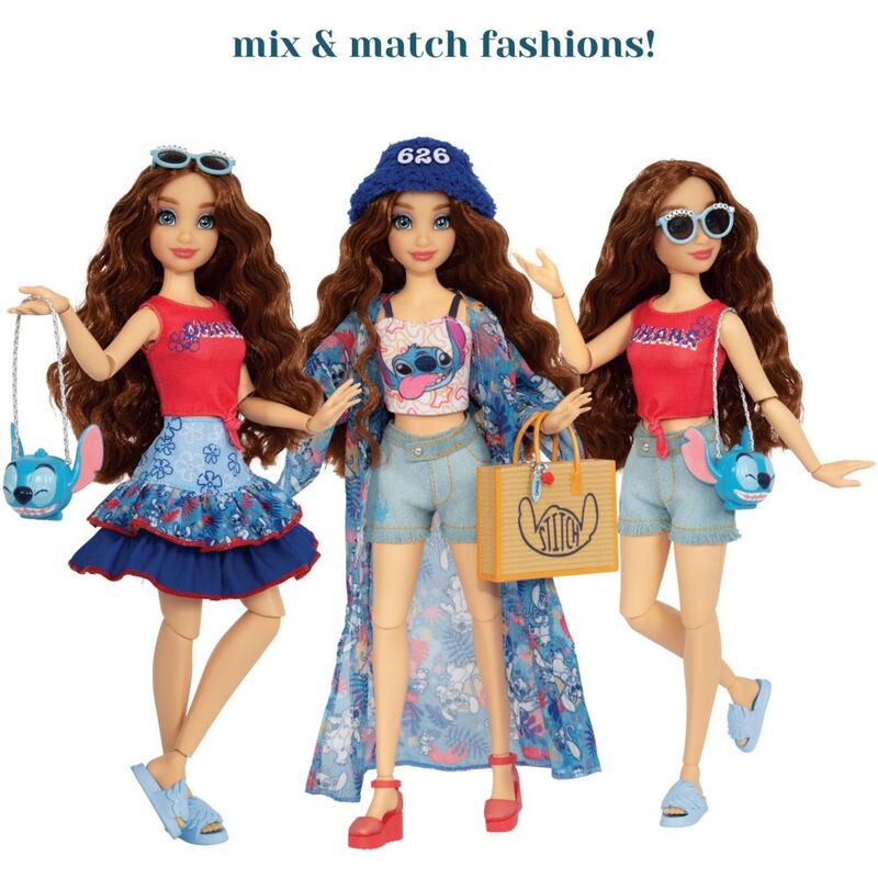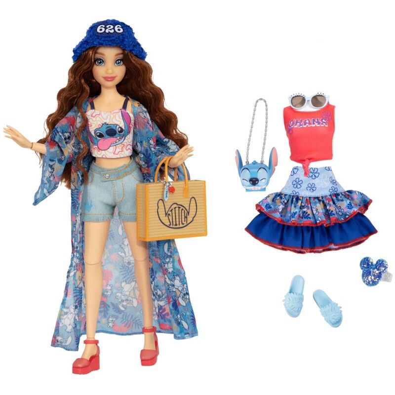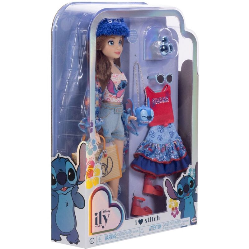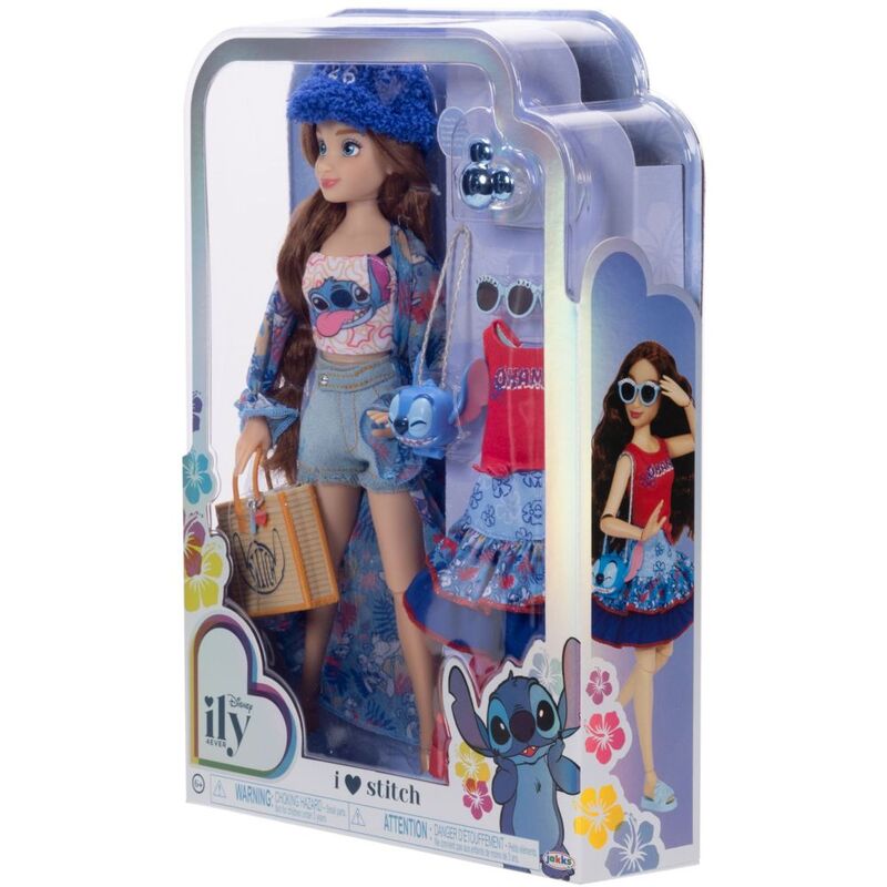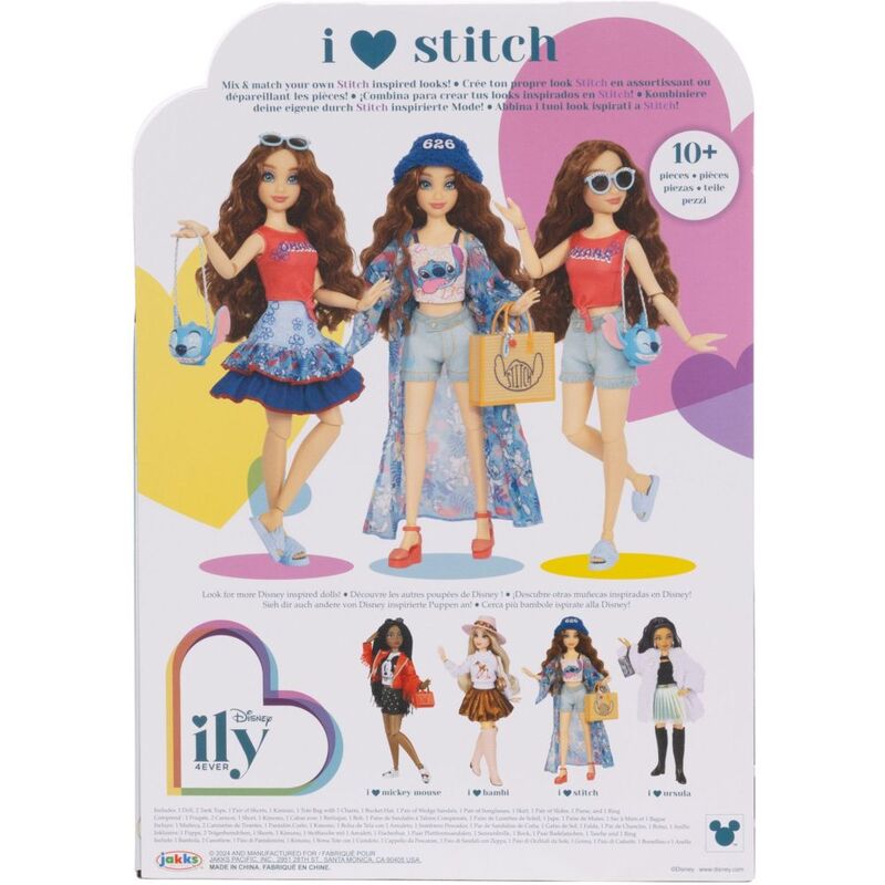 Disney ILY 4EVER I love Stitch dolls look fabulous in a flowy kimono and fuzzy bucket hat. Two complete mix-and-match outfits to create your own Stitch-inspired looks! Collectible Mickey Mouse shaped encrusted glitter ring.