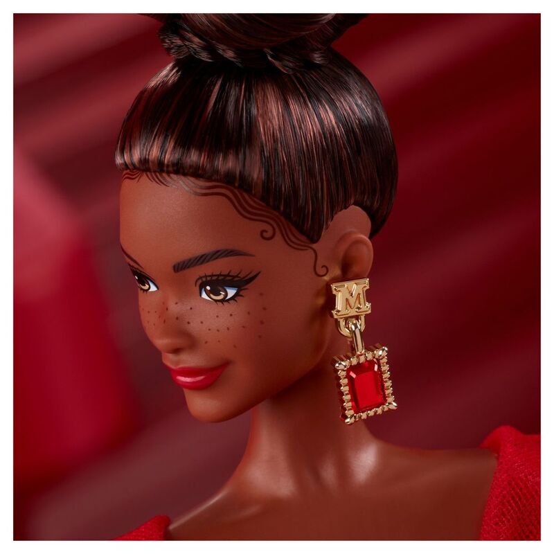 - Ruby pumps complement her dazzling look, while drop earrings with a golden “M” pay homage to the old-school Matty Mattel logo.
