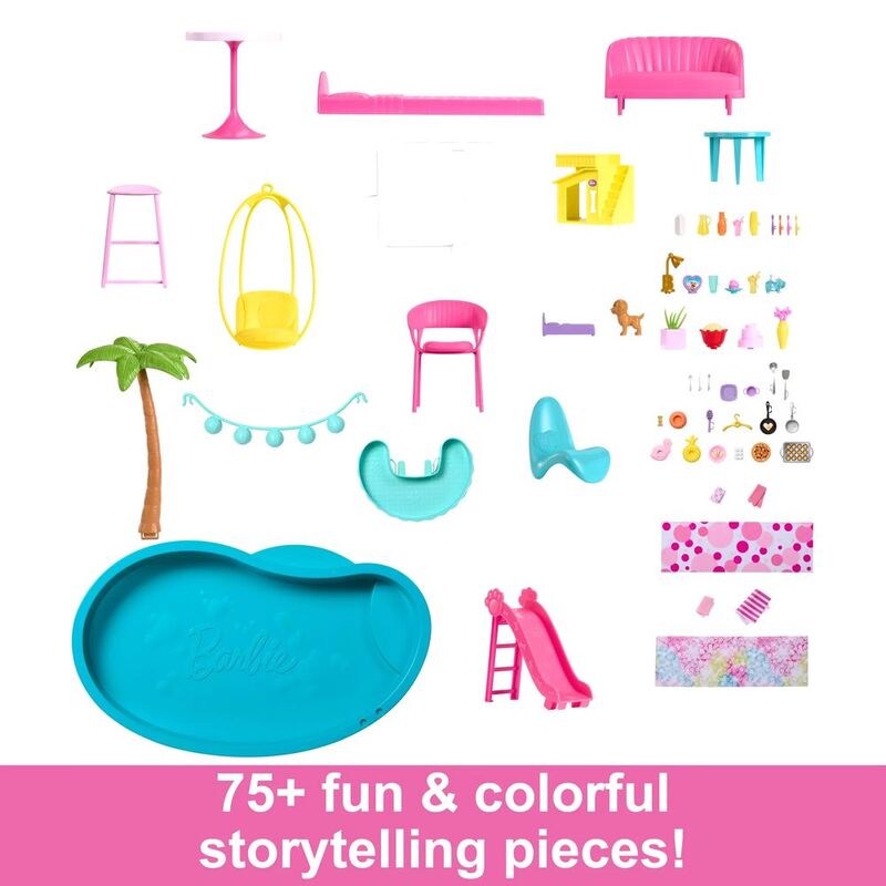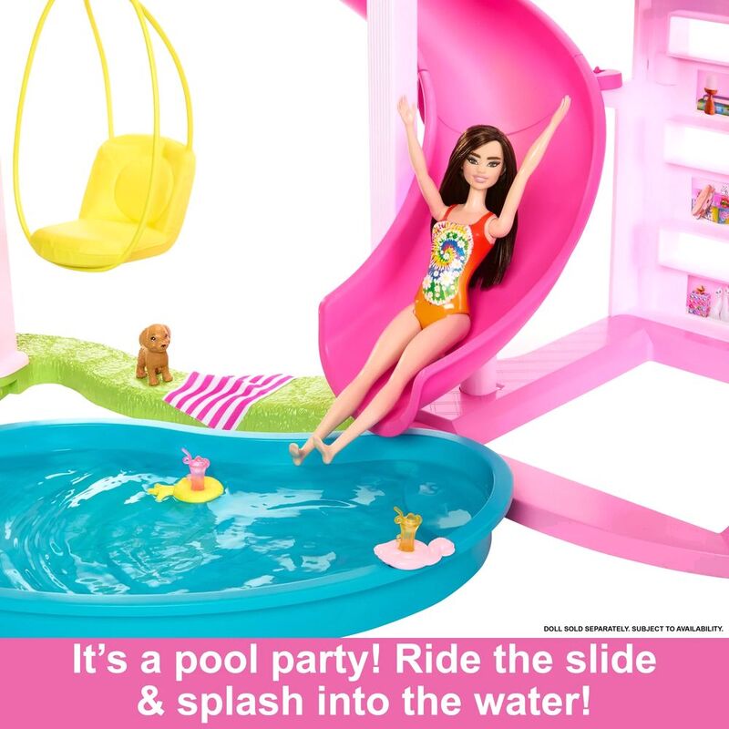- Barbie® can host the pool party of her dreams with her home’s spectacular three-story spiral slide. Watch as Barbie® doll and her friends swirl down the slide into the pool! Dolls not included.