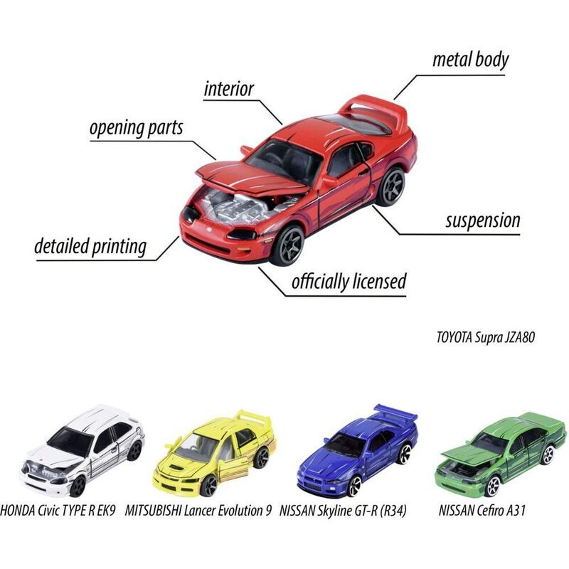 Experience the power and elegance of Japanese automotive design with the Majorette Japan Series gift pack. This set features five realistic and high-quality Japanese dream cars: Nissan Cefiro 31, Nissan Skyline GT-R (R34), Toyota Supra JZA80, Mitsubishi Lancer Evolution 9, and Honda Civic Type R EK9.